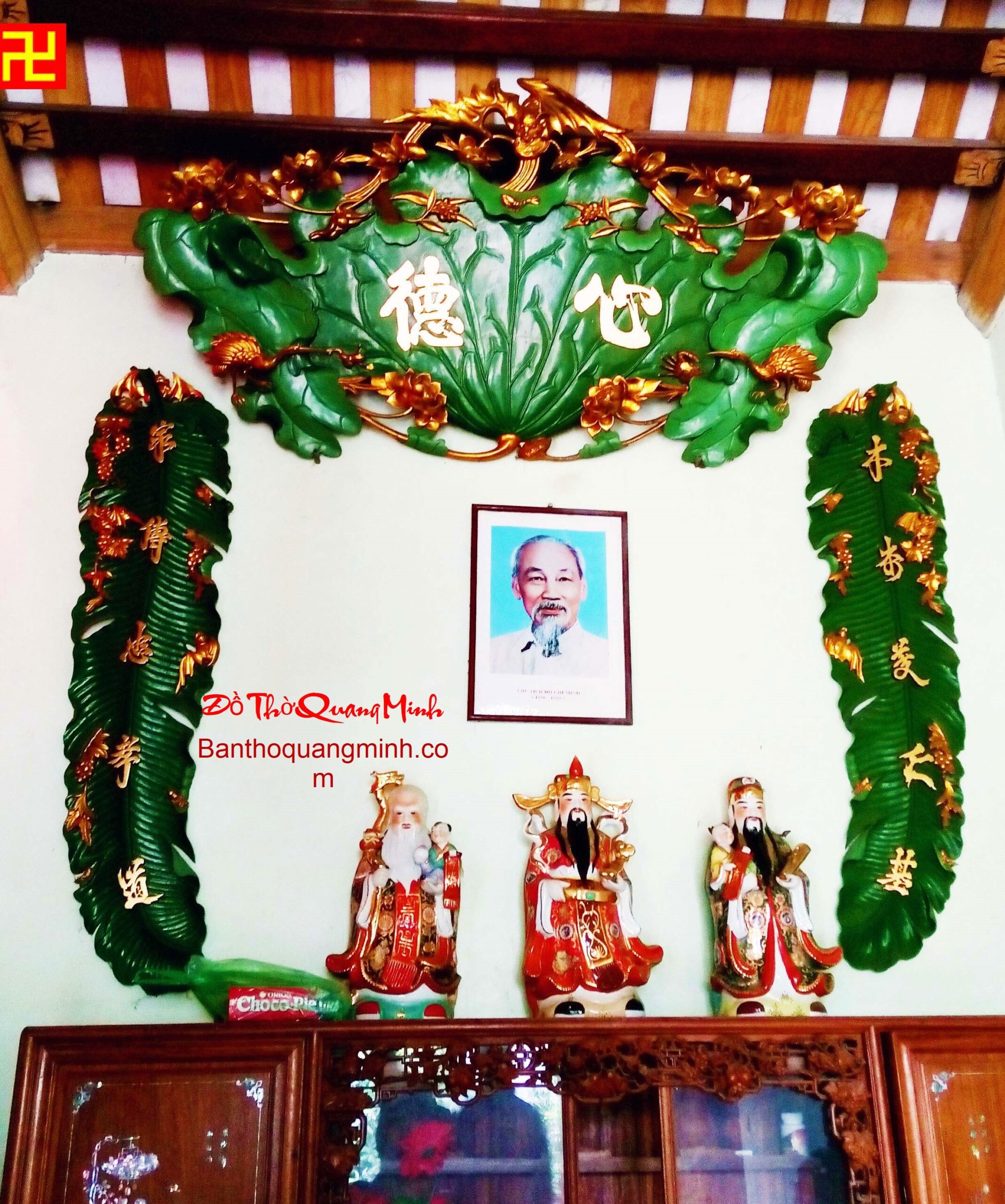 Bộ hoành phi câu đối cách điệu bằng lá sen sơn giả cổ đẹp